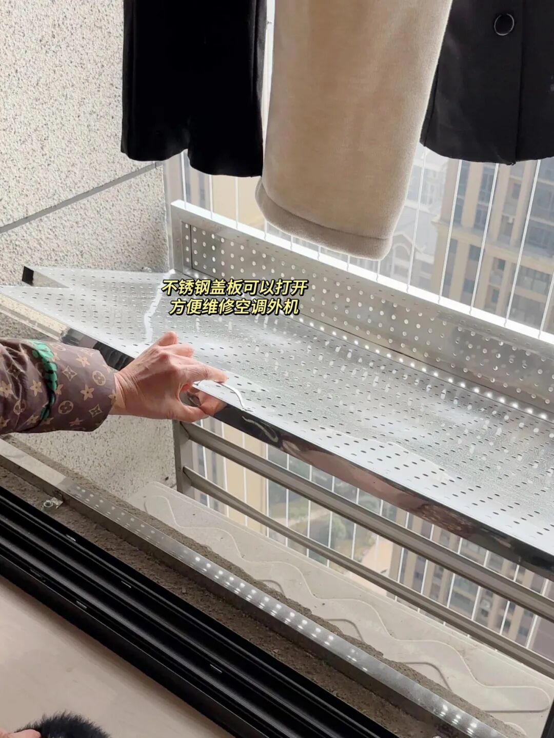 先在平台装防护网防衣物掉落,再定制一块可以掀起来的不锈钢洞洞板,既能滤水又能防止衣服掉下去,最后架上晾衣杆,一个实用的晾衣区就搞定了。