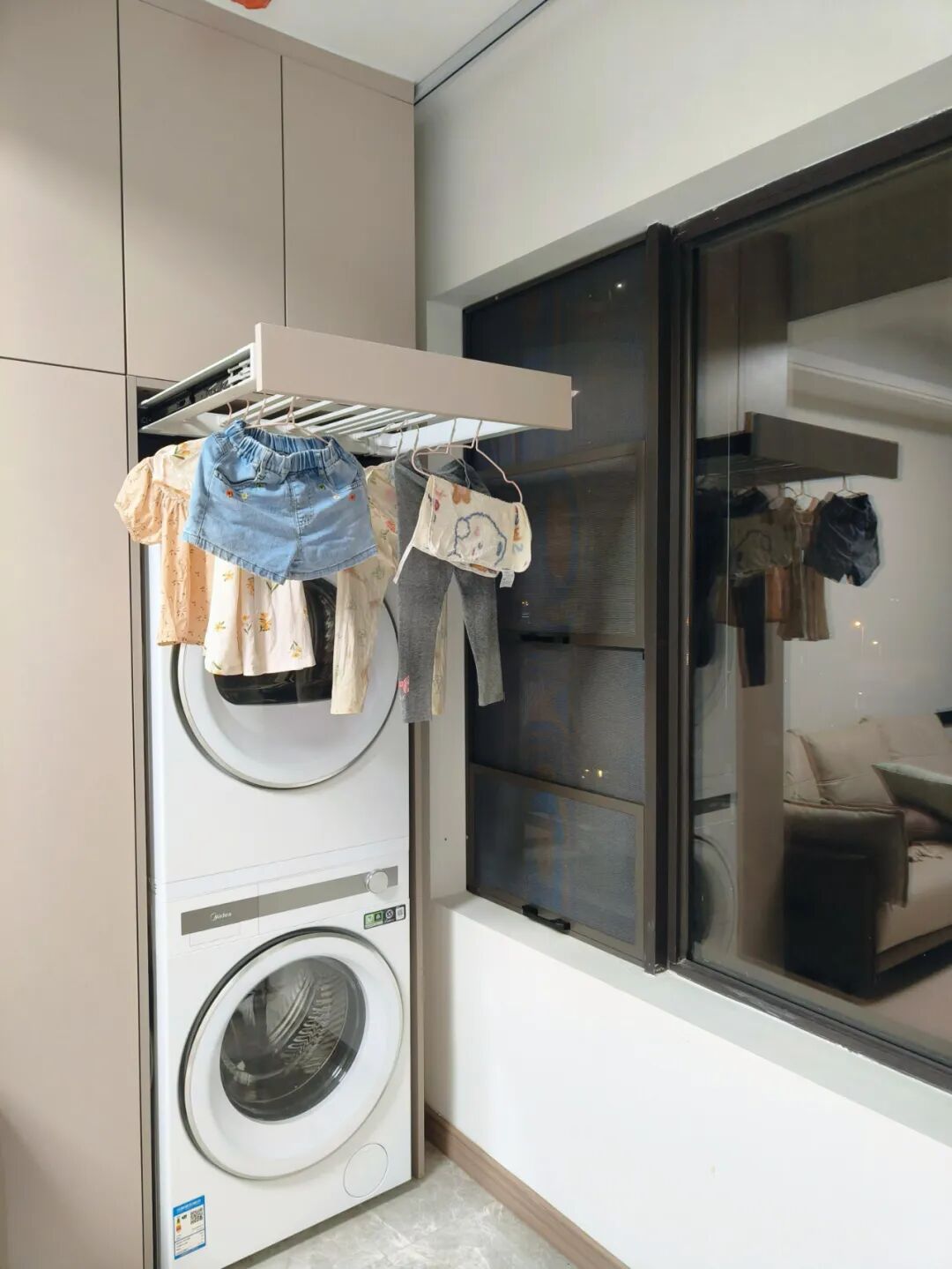 尤其南方回南天,衣服晾一周都能拧出水,烘干机两小时直接穿,还软乎乎的。烘干机上面加个隐形伸缩架,晾点小袜子、内衣,不用时推回去,根本看不出来。