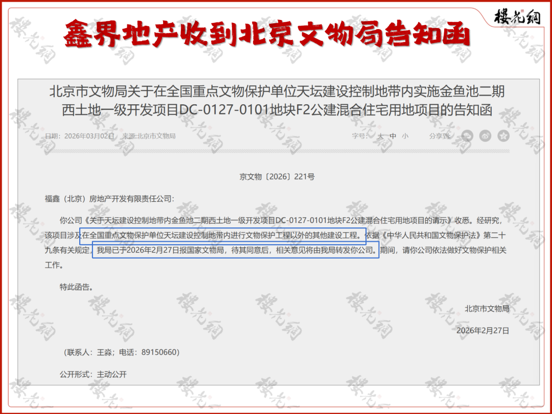 3月2日,它收到了一封告知函,是北京市文物局下发的,关于东城区金鱼池DC-0127-0101地块。