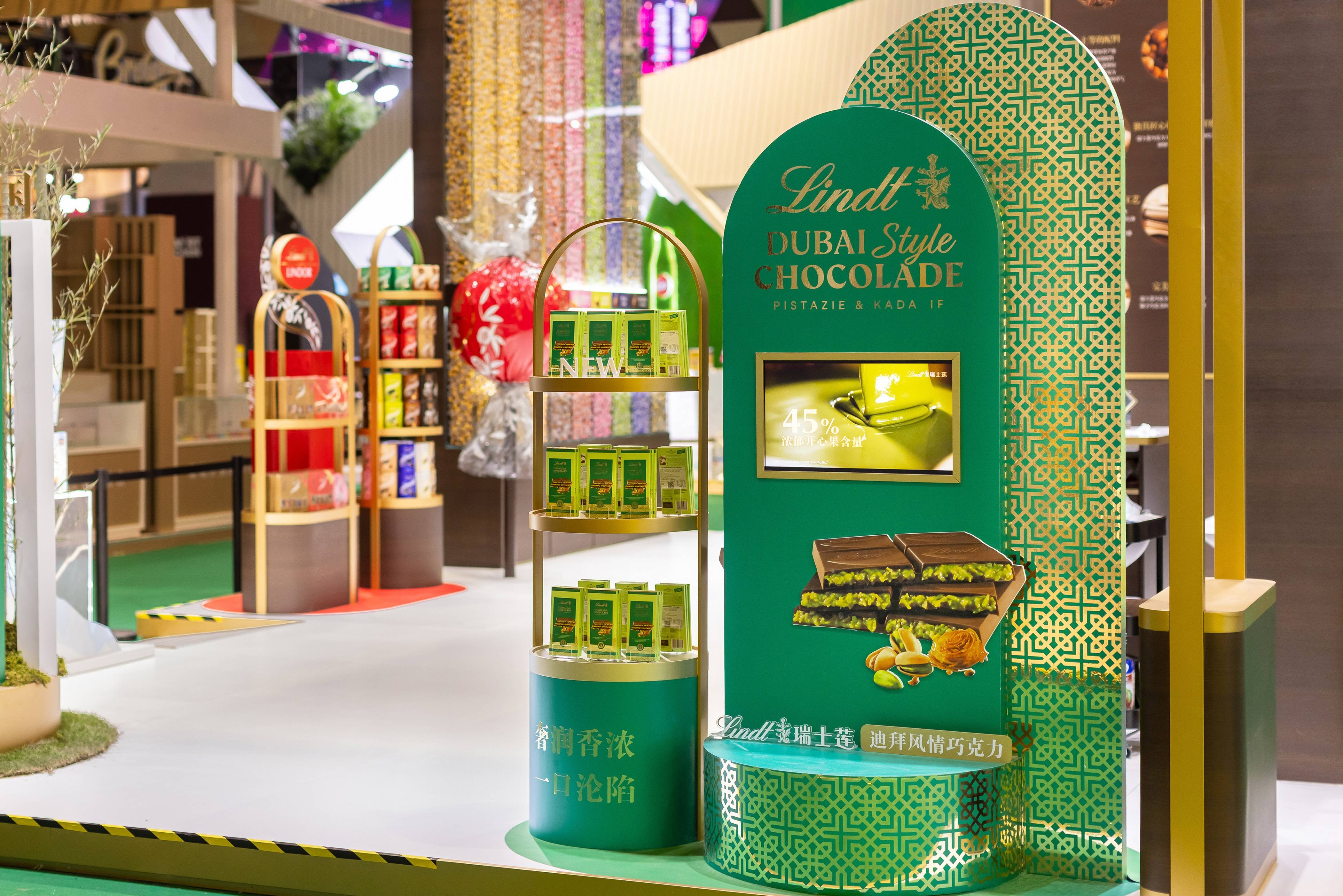 此外,今年3 月首次登陆中国的迪拜风情巧克力也同步亮相展台。产品融入迪拜风情与甜品精髓,将高达45%开心果含量的浓郁开心果酱芯和传统卡达耶夫甜品精髓巧妙融合,为细腻幼滑的牛奶巧克力注入了酥脆香浓的独特感受,呈现出三种奢靡口感层次,带来无与伦比的奢华体验。