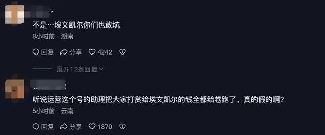 更过分的是,不法分子趁机冒用埃文的名义发视频,收取打赏。这一操作,不仅让埃文凯尔损失了收入,最重要的是,也让他在粉丝中丧失了信誉。粉丝们当然不干了,纷纷在社交平台上发声,怒斥这些不法分子。