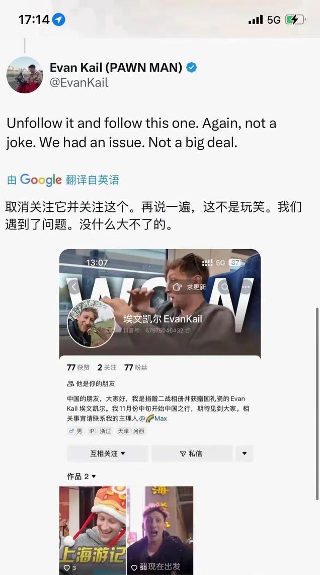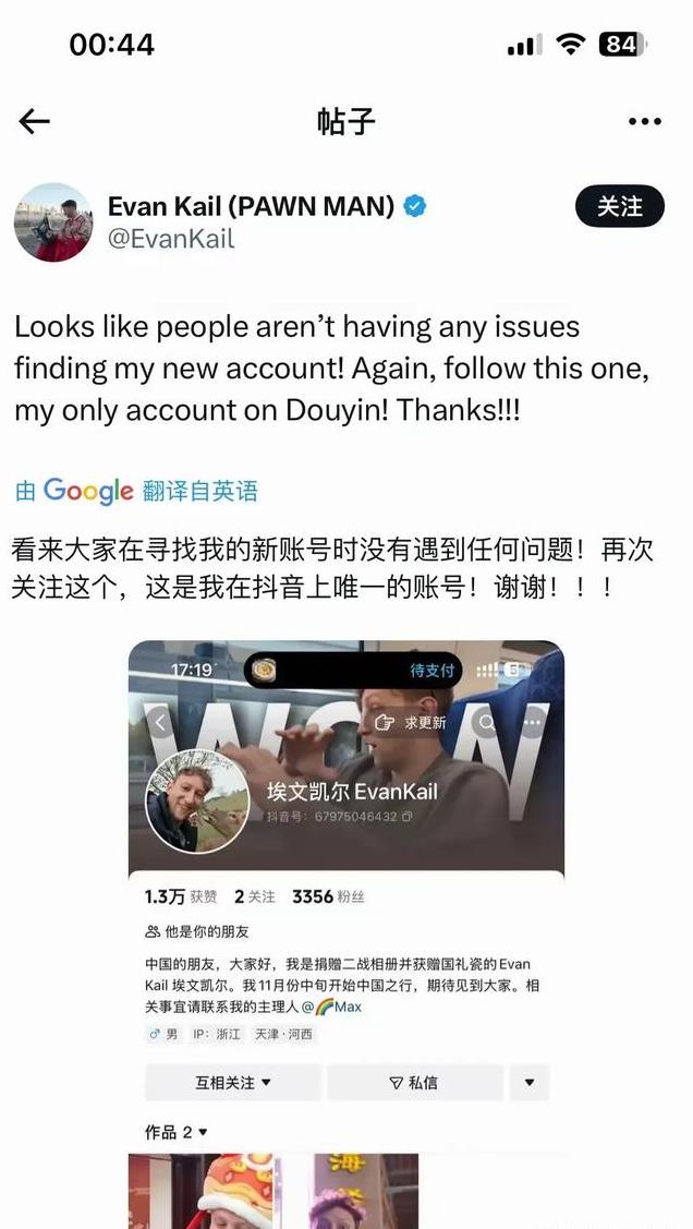 埃文凯尔,是个外国人,在中国搞网络直播和内容创作并不容易,尤其是要在国内社交平台上有个账号,还得借助别人。