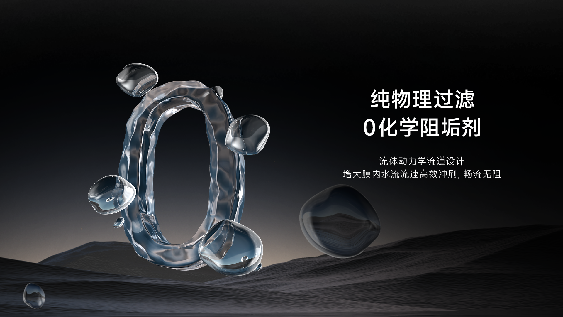 更关键的是,U06旗帜鲜明地采用了0化学阻垢剂的纯物理过滤方案。通过创新的流体动力学流道设计与智能全时冲洗系统,大幅提升膜内流速以物理方式抗垢,将RO膜堵塞风险降低90%。这不仅彻底杜绝了因阻垢剂(磷酸盐类)可能带来的潜在健康疑虑,也从源头避免了含磷废水对环境的影响。对于用户,这是对“入口安全”与“环境友好”的双重保障,让安心再无死角。