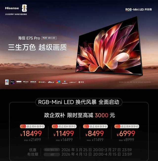 从底层技术突破,到全维配置升级,再到环保健康的责任落地,海信E7S Pro不仅以极具诚意的定价,让高端RGB-Mini LED技术走进普通家庭,更重新定义了2026年旗舰电视的标准。
