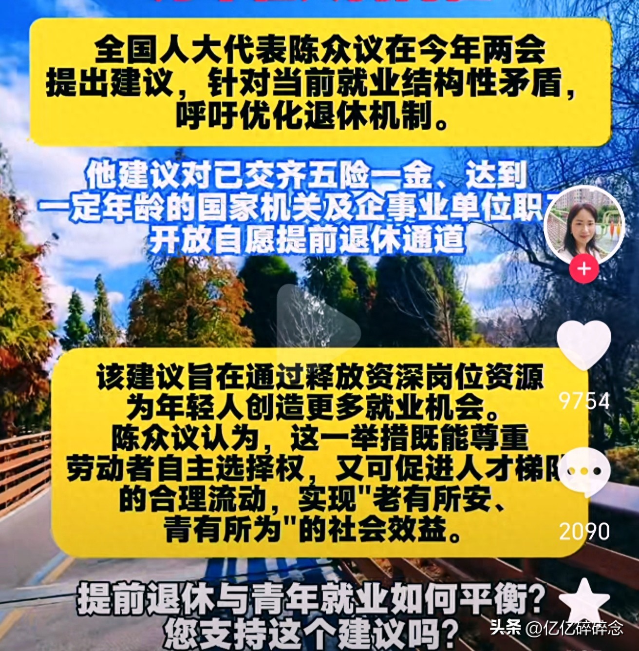 全国两会期间,全国人大代表陈众议的一句“允许符合条件的职工自愿提前退休”,像是无意间戳中了某根神经,热搜一夜之间被刷屏。别小看这十个字,背后藏着太多人的焦虑和期待。