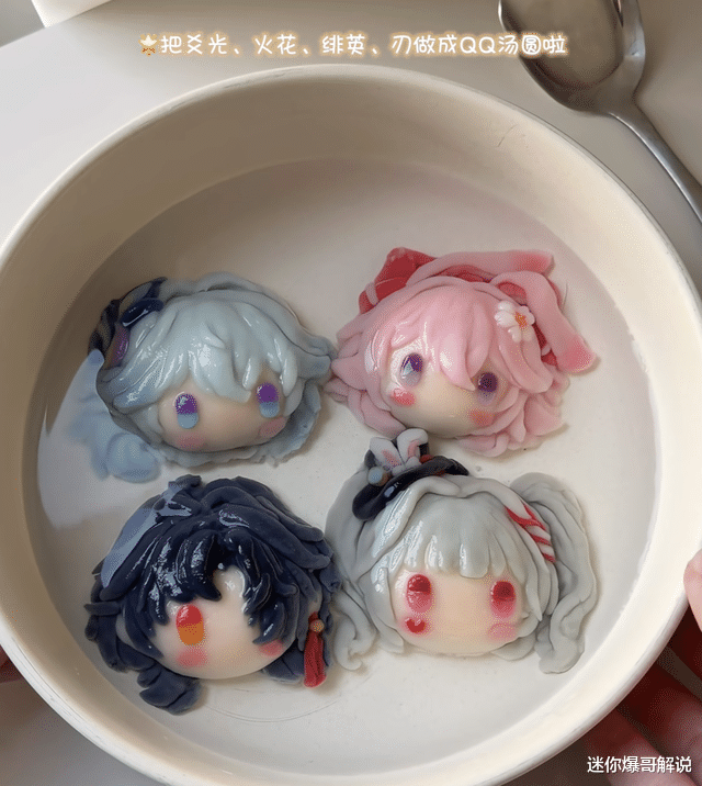 崩铁目前正好进行到4.0版本,这位手工大佬也是紧跟游戏版本的节奏,做的汤圆是当前版本剧情中登场的几位角色外形的汤圆,有爻光、火花、绯樱,以及刃。