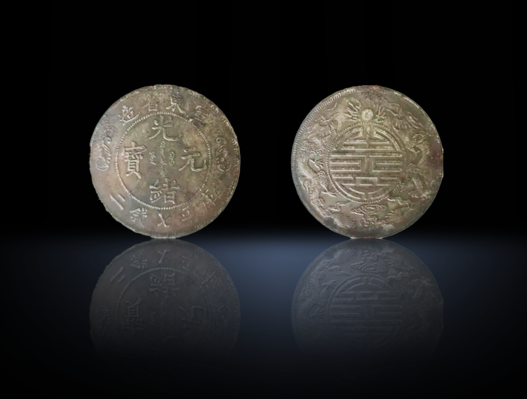 此枚广东省造光绪元宝库平七钱二分双龙戏珠寿字币正面珠圈外上端镌刻“广东省造”四字,下端镌刻楷书“库平七钱二”五字,左右两侧各镌有一蝙蝠图案,珠圈内铸有“光绪元宝”四字。银币背面珠圈外铸双龙戏珠图案,珠圈内铸一圆形“寿”字。银币设计极富特色,正面两侧所铸的一对蝙蝠图案寓意吉祥。因蝙蝠的“蝠”字与“福”字谐音,在币面上铸蝙蝠图案意在取“蝠”、“福”两字谐音,与背面的“寿”字相对应,寓意“福寿双全”。藏品品相精致,其审美风格独持,钱币正面鲜然可见满汉文化的融合,而钱背却明确标示了西方文化的介入。其包浆入骨,熟旧自然,深打字口清楚,流通痕迹明显,边齿过关,龙鳞清晰,因该币为纪念慈禧七十寿辰而铸,所以铸额不大,相当稀少,大多奉献给清廷或赠于当时的达官显贵,流传于民间的很少,具有极高的投资价值和收藏价值。