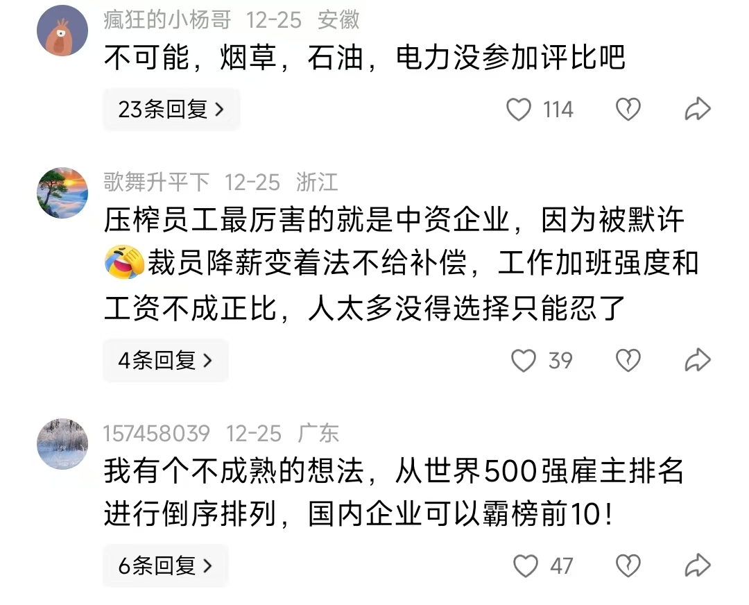 网友的讨论也戳中了痛点。有人在我发布的榜单截图下留言:“不意外,国内很多科技公司只谈奋斗不谈福利,谁愿意真心推荐?”还有职场人分享亲身经历:“之前在某大厂,一年就休了5天年假,晋升全看熬时长,这样的企业怎么可能上最佳雇主榜?”也有理性的声音说:“53家中国企业入选已经比往年多了,但排名靠后说明我们在员工体验上还有很长的路要走。”
