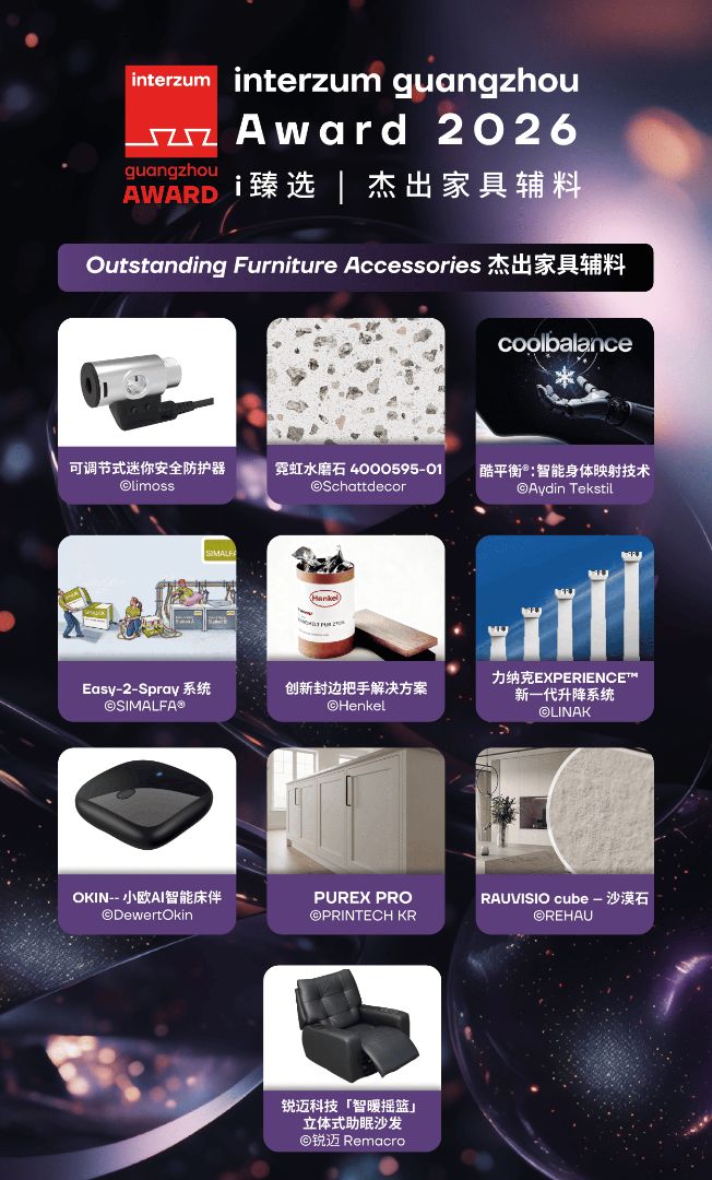 本届获奖产品将于2026年3月28-31日,在中国广州国际家具生产设备及配料展览会(CIFM / interzum guangzhou)现场特设的「interzum guangzhou Award展示区」(广州琶洲·广交会展馆C区,14.1馆C02)展出。获奖企业还将在展会首日的颁奖典礼上接受荣誉表彰,诚邀全球业界人士亲临现场,共襄行业盛宴。