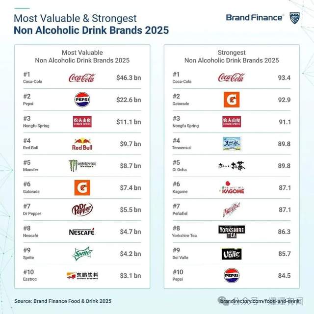 2025年,国际权威品牌评估机构Brand Finance发布的报告显示,农夫山泉品牌价值达110.9亿美元,同比增长33.6%,在全球软饮料品牌中排名第三,仅次于可口可乐和百事可乐。