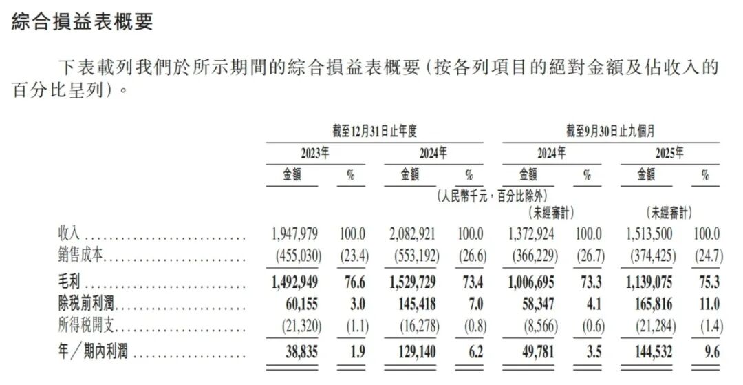 招股书显示,2023年、2024年和2025年前三季度,该公司的销售及分销开支分别为12.68亿元、12.38亿元和8.71亿元,收入占比分别为65.1%、59.4%和57.6%。如果将这笔费用进一步拆分,推广开支占同期销售及分销开支的比例达87.9%、84.7%和82.6%