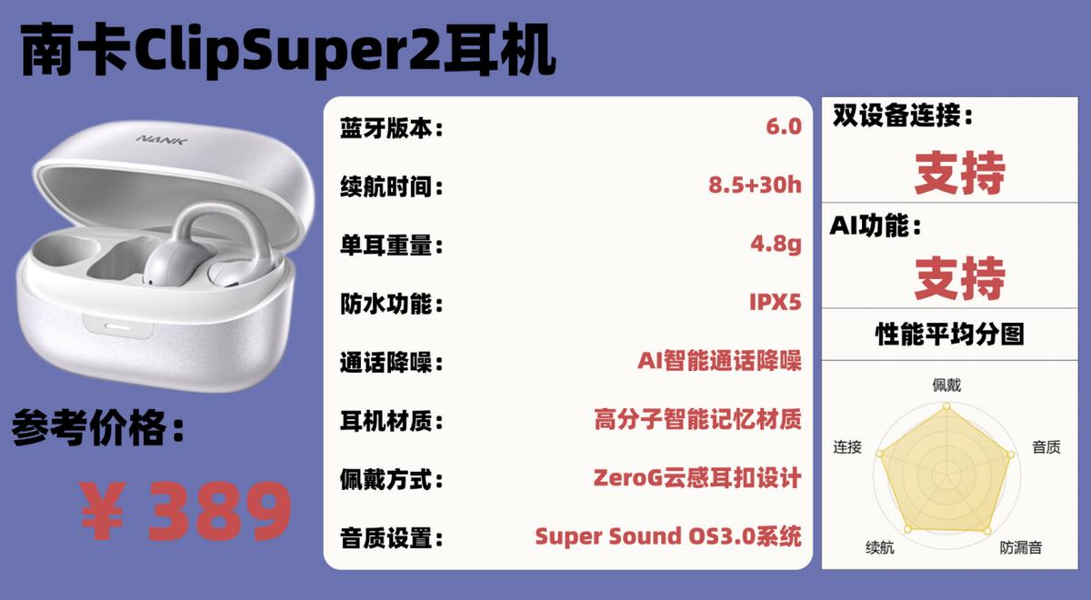 综合来看:南卡ClipSuper2在佩戴舒适度、音质表现、防漏音以及AI功能实用性上表现非常全面!4.8g的轻量化设计加上ZeroG云感耳扣,让长时间佩戴几乎无负担,音质在百元耳夹中堪称天花板,适合追求性价比和真实听感体验的用户。