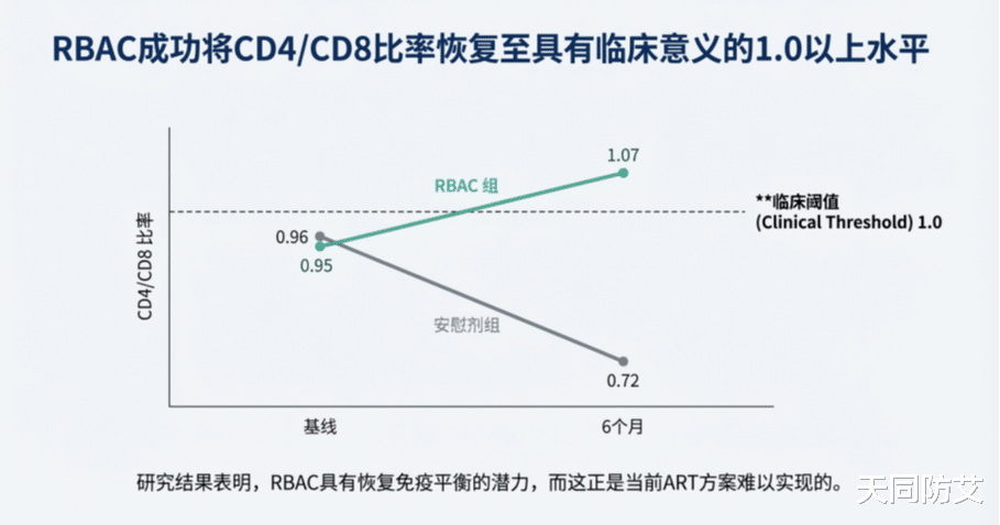 关键突破:CD4+/CD8 + 比值(免疫平衡核心指标)——RBAC 组从基线 0.95 改善至 6 个月时的 1.07,成功突破 1.0 的临床关键阈值,意味着免疫失衡状态得到显著改善;而安慰剂组则从 0.96 下降至 0.72,失衡进一步加重;