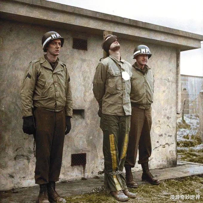 1944年,一名身穿美军制服的德国突击队战俘,被美国行刑队处死…在国际法中,穿敌方制服被俘,那就是间谍,不受日内瓦公约保护了。