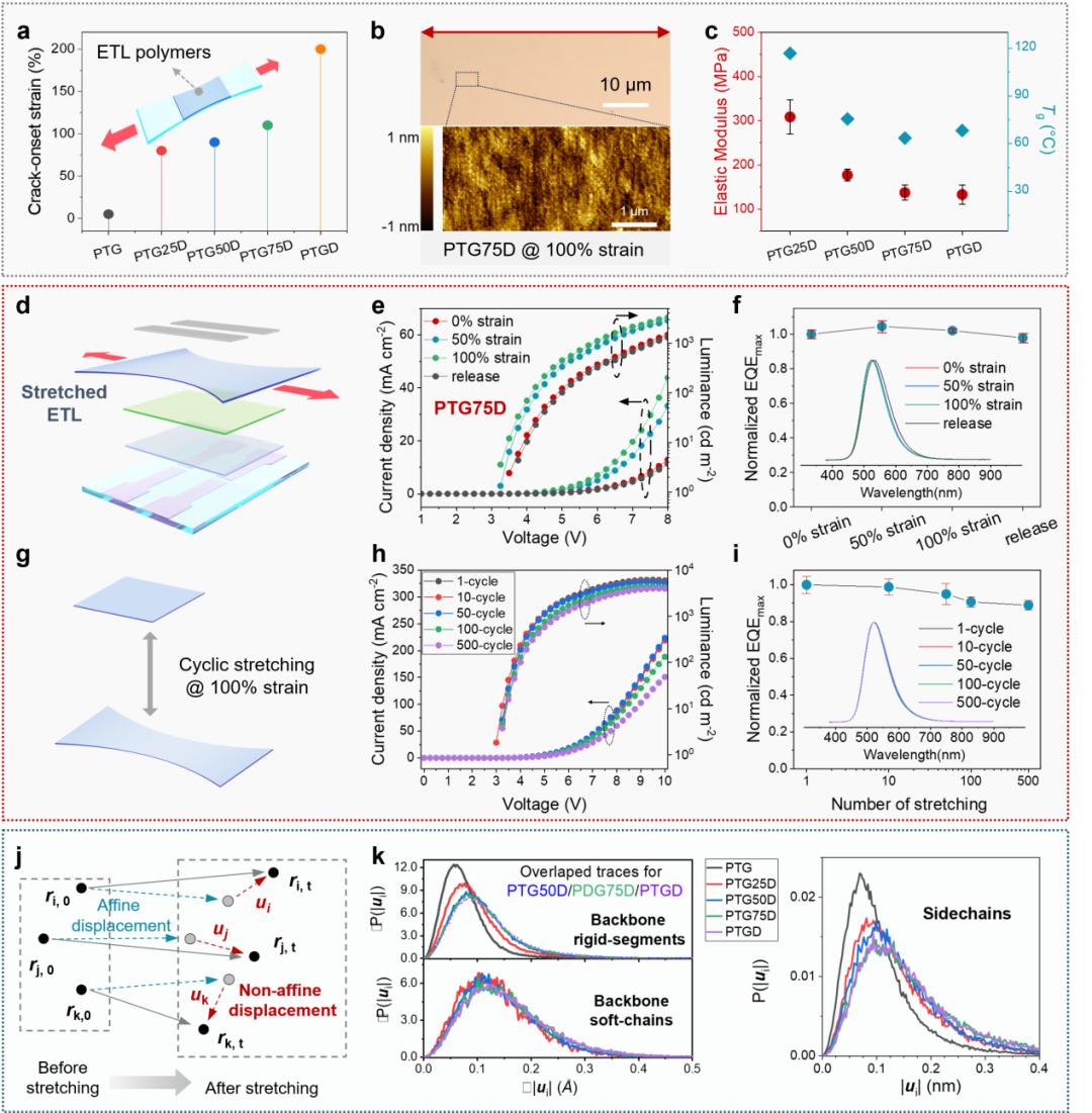 当这条全新的“柔性电子高速公路”即 PTG75D 聚合物,遇到“柔性电子发射站”即脆化铝阴极的时候,并且与已有的高性能可拉伸发光层和阳极结合时,便发生了本文开头提到的性能。
