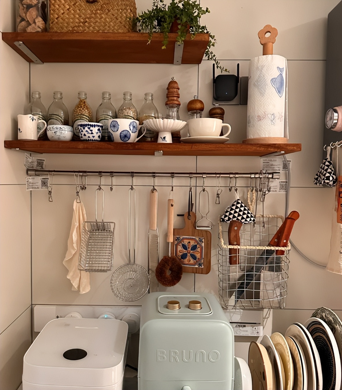 厨房墙面比较多,大家只关注打柜子,却忽视了墙面,墙面只需要一点小小的改动,就可以增加收纳空间。