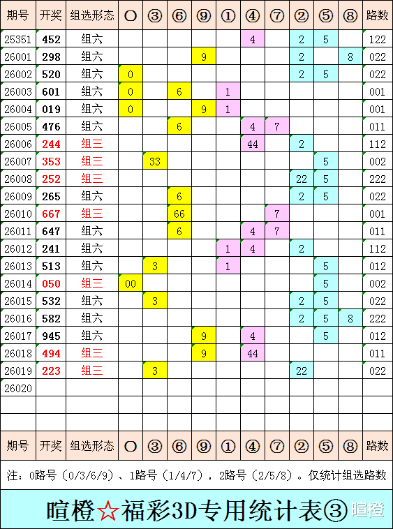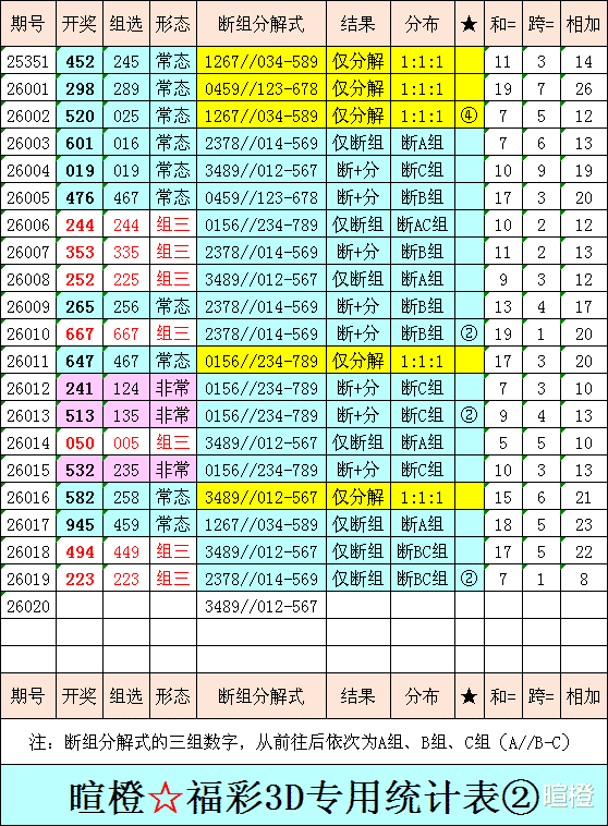 26020期:暄橙福彩3D综合条件(本期将在1月20日21:15开)一、上期回顾 ☆1、上期开奖号:2 2 3。2、和值= 7,跨度= 1。3、组三形态,022路组合。4、热度分布(热:温:冷)2:1:0。二、本期条件 ☆1、三期缺码:01678。2、热:2345,温:09,冷:1678。3、断组分解式:3489//012-567。4、四胆:2356;三胆:356。三、术语解释 ☆1、三期缺码:0至9这十个自然数当中,未在近三期开奖号出现的数字。2、热度(热温冷):自然数0至9,在近七期开奖号中,出现3次及3次以上的数字,称为热码;出现2次的数字,称为温码;出现1次和未出现的数字,称为冷码。某个数字在开奖号中出现几个,就按几次计算。3、断组分解式:将0至9这十个自然数,分成三组数字,从前往后依次为A组(4码)、B组(3码)、C组(3码),一般情况下,有一组数字不出码,偶尔会有两组数字不出码。A组不出码的情况相对较少。断组为主,分解为辅。4、常态组六号码:同时包含大数、小数、奇数、偶数、质数、合数的组六号码,共有72注。统计表中,简称“常态”。5、非常态组六号码:全大数、全小数、全奇数、全偶数、全质数、全合数等六种形态的组六号码,共有48注。统计表中,简称“非常”。★提醒:彩市有风险,参与须谨慎!水平有限,仅供参考!