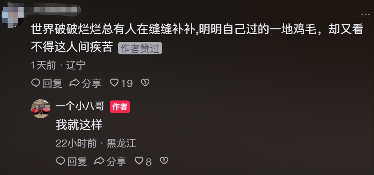 有的网友说:世界破破烂烂总有人在缝缝补补,明明自己过的一地鸡毛,却又看不得这人间疾苦