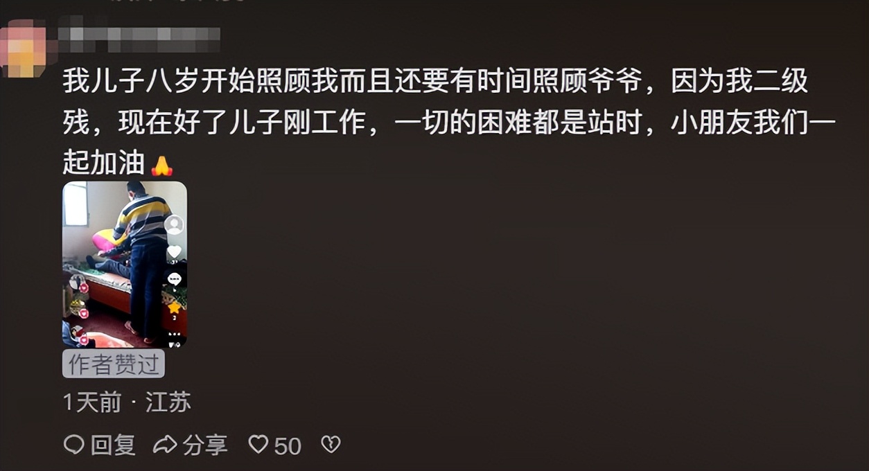 还有的网友说:我儿子八岁开始照顾我而且还要有时间照顾爷爷,因为我二级残,现在好了儿子刚工作,一切的困难都是暂时,小朋友我们一起加油。
