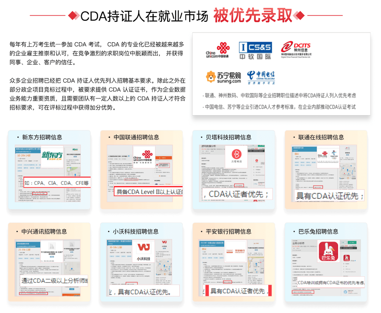 就业方向: 互联网大厂做数据分析师、金融银行技术岗、商业智能顾问、市场研究、产品、运营等。相比于传统会计证书,CDA更强调数据驱动决策,让你在财务之外拓展到商业分析、运营优化等多元岗位,适应未来职业跨界需求。