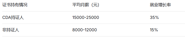 从薪资数据来看,CDA证书的回报率显著。根据行业调研显示,持证人的平均薪资比非持证人高出40%以上,尤其在互联网和金融行业,这种差距更为明显。