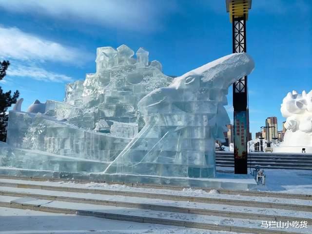 呼伦贝尔古城:国家级旅游休闲街区,夜晚的冰雕在灯光映照下美轮美奂,融入了冰雪运动元素,很适合拍复古时髦的大片。