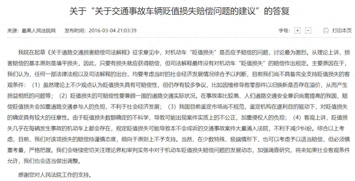 此项符合最高人民法院在《关于“交通事故车辆贬值损失赔偿问题的建议”的答复》中表明的立场:原则上不予支持车辆贬值损失。