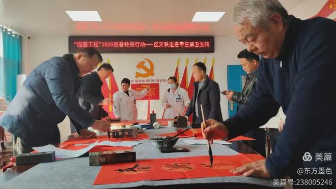 2026年1月16日上午,为深入落实中国文联“强基工程”2026新春特别行动部署,阜阳市颍东区文联组织区内书法艺术家走进枣庄镇卫生院,开展“翰墨扬清风、文艺迎新春”志愿服务活动,将墨香年味与新春祝福送到基层医务工作者身边。