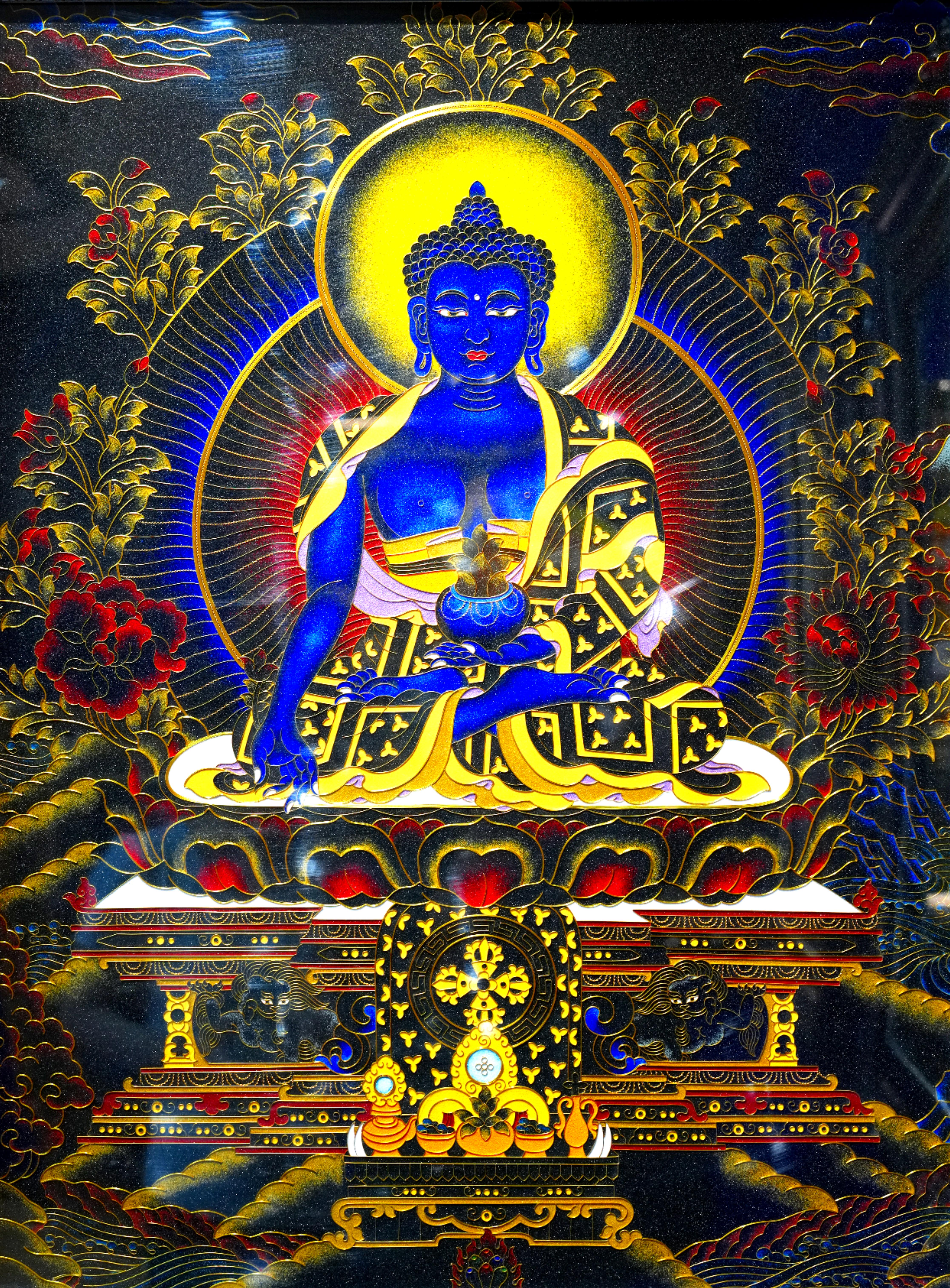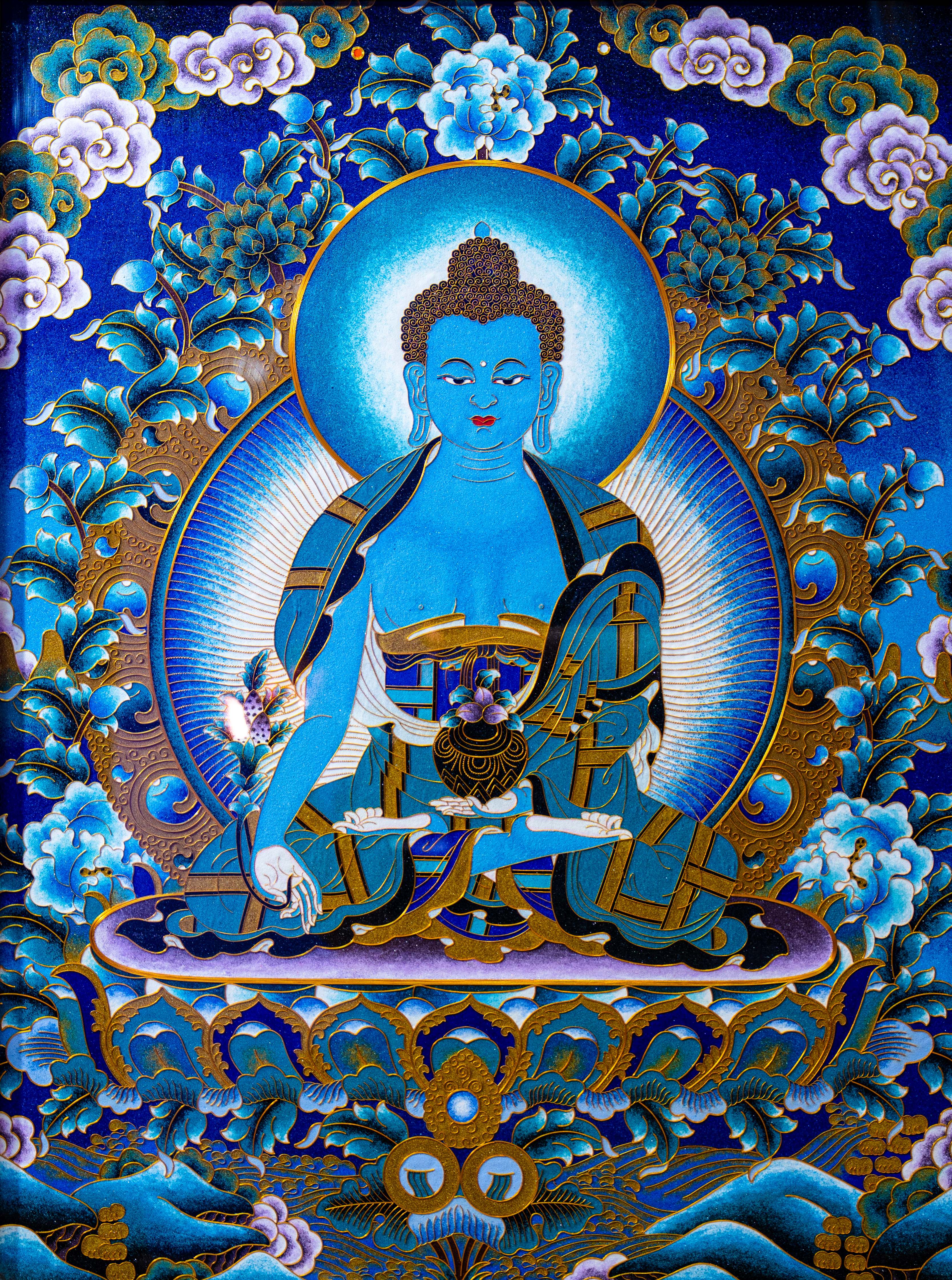 色彩是这幅唐卡的灵魂,全部采用热贡古法矿物颜料调制。药师佛的琉璃蓝色身像,并非普通工业颜料,而是以藏地天然青金石混合孔雀石研磨调胶,经多层晕染后呈现出 “润而不冷、清而不浊” 的质感,恰如其 “琉璃光遍照” 的寓意;莲台的红色取自雪域朱砂,经古法炮制后晕染,与琉璃蓝形成柔和对比,象征 “消灾纳福”;背景的宝相花用金线掐出轮廓,填入珍珠粉调胶的白色颜料,在光线下泛着温润光泽,整个画面仿佛裹着一层柔和的光晕。