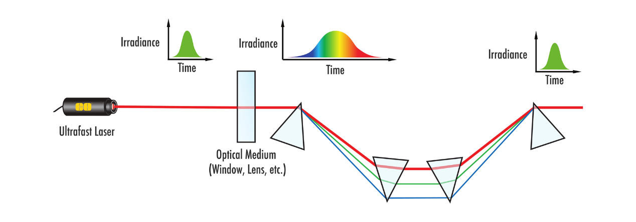 • 挑战:透镜、窗口、空气等介质会引入正GDD,导致脉冲在传播过程中被拉长。举例:10 mm N‑BK7 在 800 nm 处会把 50 fs 脉冲拉长约 12%。