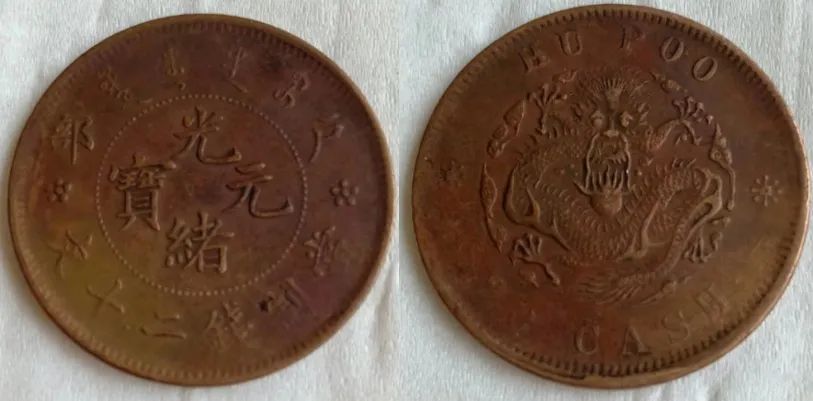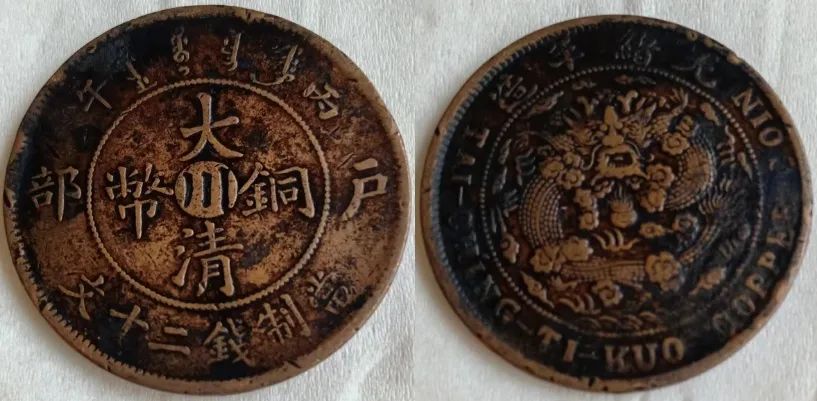 大清铜币因流通时间较短,版面设计优雅,雕刻精良,且存世量极为稀少,被誉为中国近代制币中的十大名誉品之一。此枚钱币为大清铜币川字版的当制钱二十文。正面中心铸一阴文“川”,外环铸“大清铜币”四字及珠圈,上缘铸“丙午”、下缘铸“当制钱二十文”六字,两侧为“户”“部”两字。背面为蟠龙祥云图案,外圈为光绪年造。此币造型美观,版面设计优雅,轮廓周正,铜质熟旧深沉,包浆自然,钱文深俊,字型端庄,笔画粗细得当,笔锋婉转到位。整体质地精良,形制规整,工艺精细,纹理凹凸有致,图案浮雕感强烈,龙纹极具灵韵,展现出满清皇族之霸气。整体而言钱币形制匀整,色泽均一,包浆自然,图文考究,寓意深刻,线条流畅,文字秀气,纹路细腻,浮雕感强烈。此钱币虽然经历了无穷岁月的洗礼,但纹路依然清晰可见,存留至今仍能保持此态,实属不易,从侧面彰显出高超的铸造工艺,极具收藏价值。