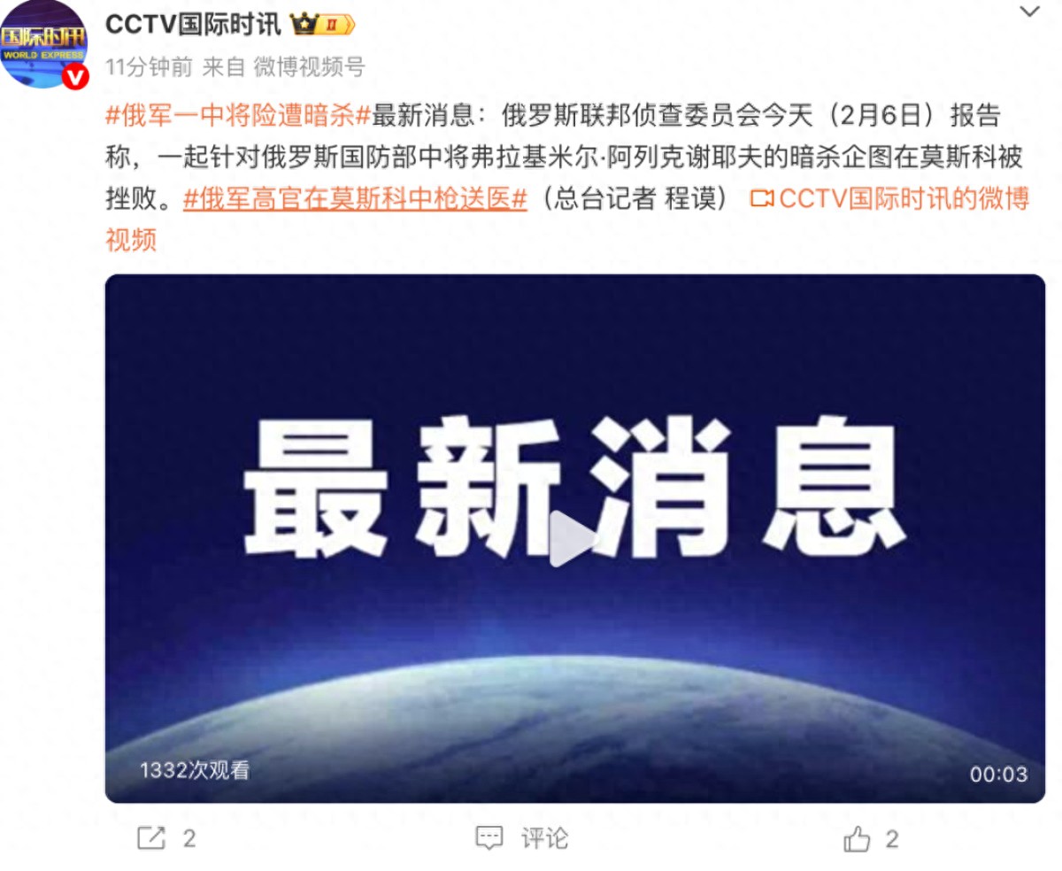 稍早前据CCTV国际时讯:俄罗斯联邦侦查委员会今天(2月6日)报告称,一起针对俄罗斯国防部中将弗拉基米尔·阿列克谢耶夫的暗杀企图在莫斯科被挫败。