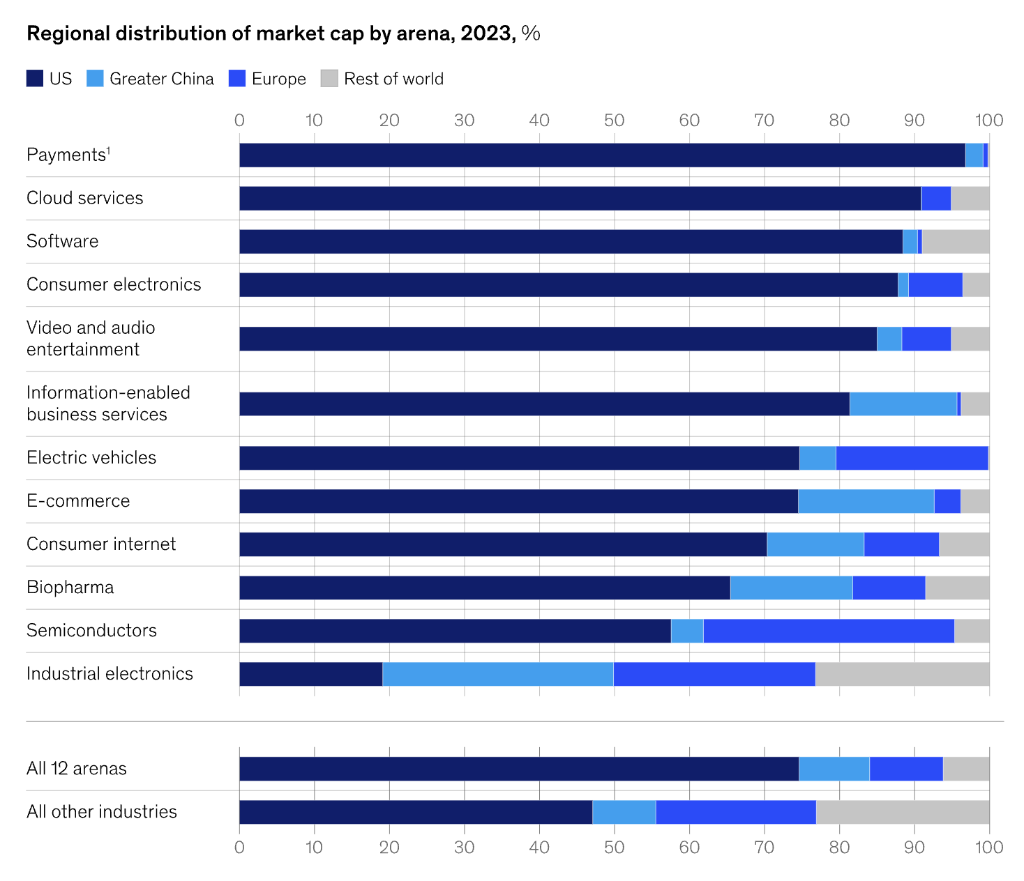 放眼全球,这些黄金赛道上的大玩家,主要就是美国和中国的公司。美国在大多数赛道里占主导,但中国在电商、电动车、半导体这些领域也占了很大份额。欧洲和世界其他地方的公司,相对来说就少一些。
