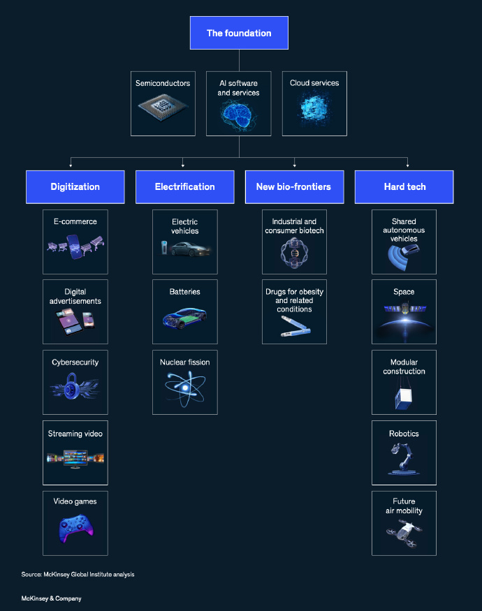 那么,这些黄金赛道是怎么来的?未来新的黄金赛道又在哪里?咱们就借着全球顶级咨询公司麦肯锡的10张图,把这事儿说明白。