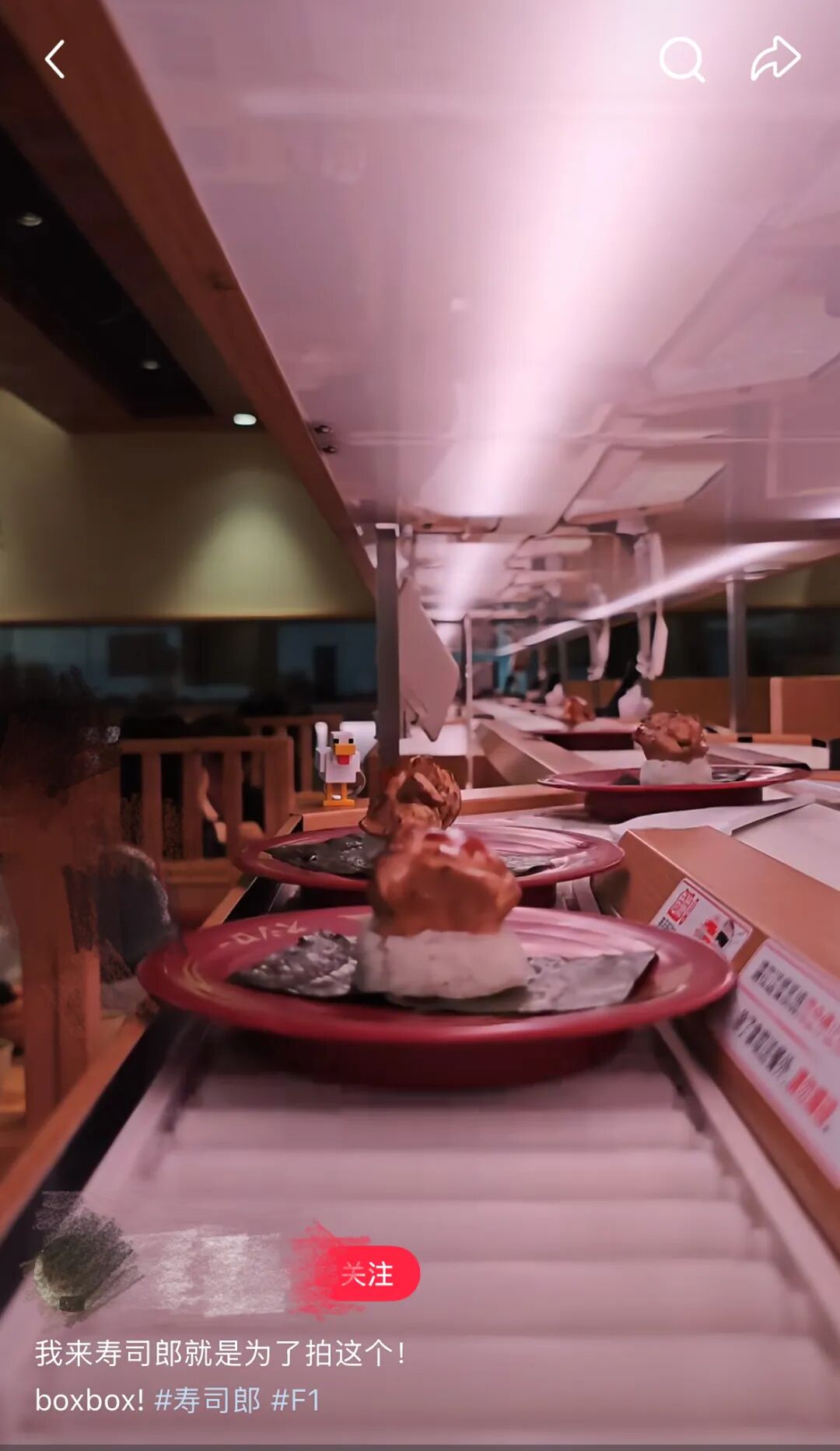 社交平台上,经常有顾客晒出送餐带视角的视频,自己点的餐呼哧呼哧地开过来,在面前紧急刹车停下,盘中两贯刺身因为惯性抖了三抖,看起来十分可爱。即便有时候还会遇到十字路口堵车的情况,加上自动送餐带的送餐速度也并没有呈几何级增长,但因为这种精准期待带来的仪式感,顾客实际上会忽略真正等餐的用时。