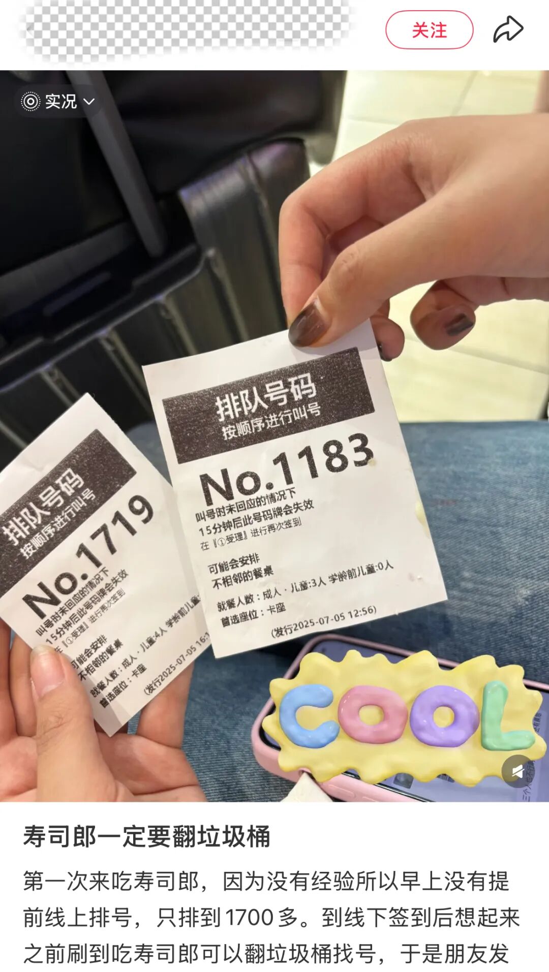 也有不用花钱的版本。有网友在等位区、门店附近的垃圾桶捡过号,一坨废纸打开之后是个已签到还没叫的号,含金量不亚于在寿司郎抽中一等奖。