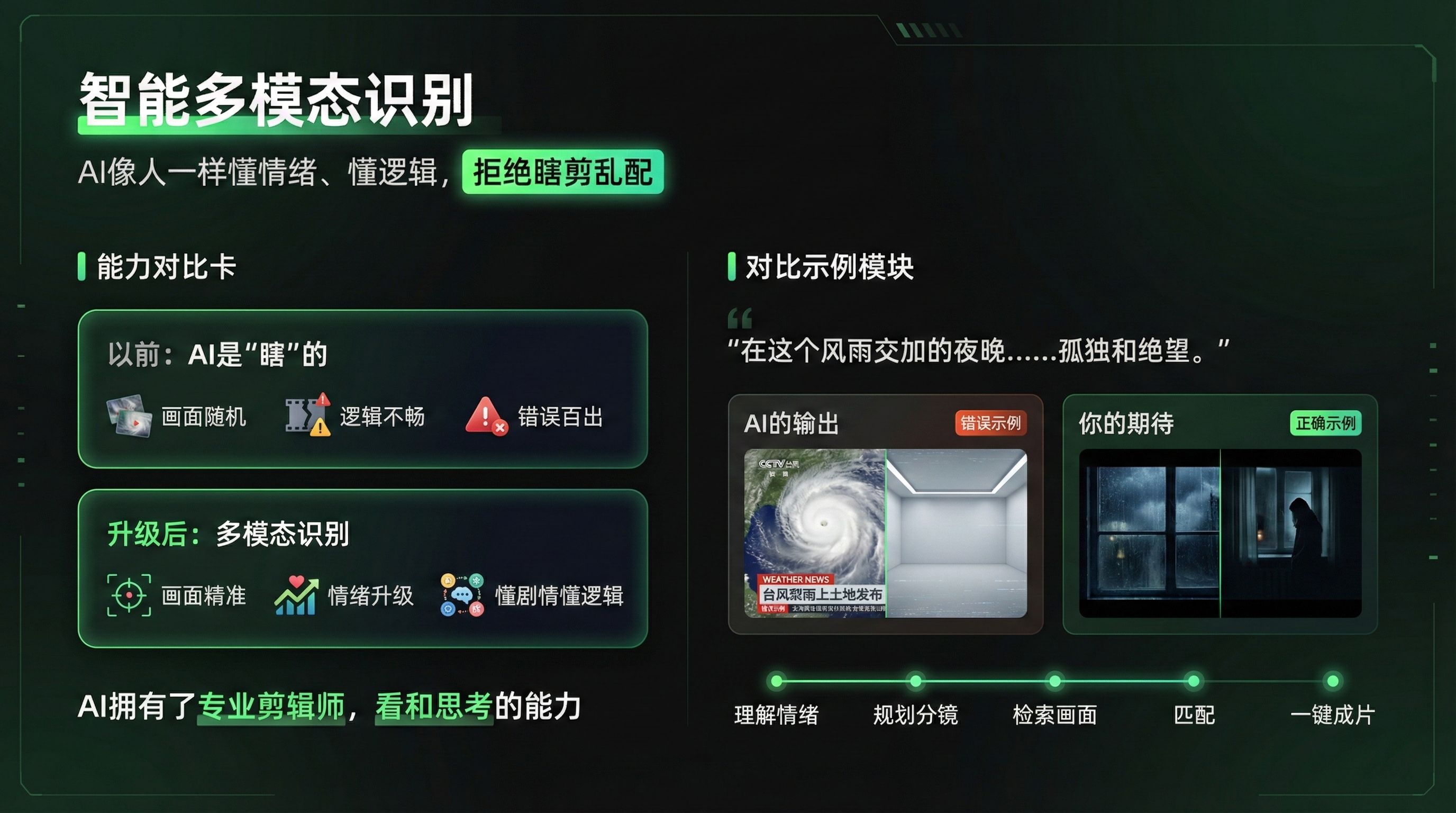 你发现了吗?这个思路和前面说的"专业剪辑师的思考过程"几乎一样——先判断情绪,再构建画面需求,最后去素材库里找。只不过人类剪辑师用的是经验和直觉,AI用的是视觉日志和情绪模型。