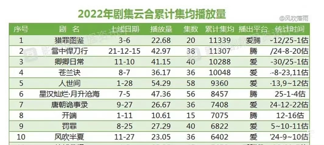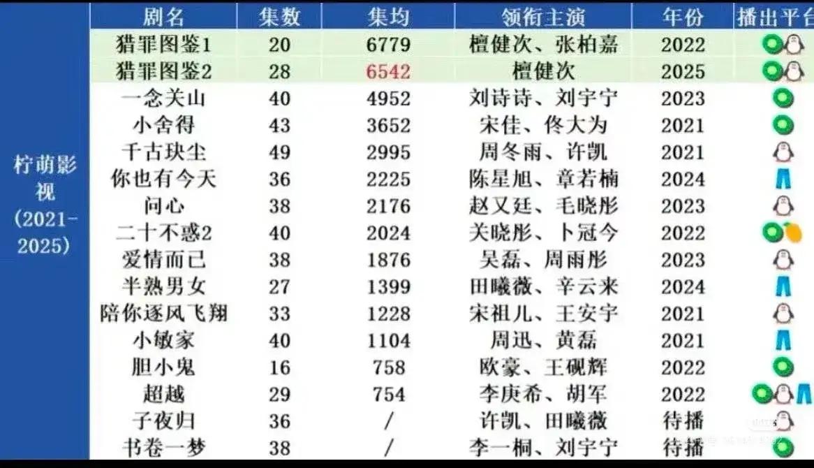 看到下面这张图我才知道柠檬影视集除了《猎罪图鉴》,均集6000万以上的剧竟然是0部? 翻看柠檬影视2021-2025集均表,檀健次主演的《猎罪图鉴1》为列第一名,《猎罪图鉴》第二名,猎罪系列集均都在6400万+,典型的小投入大回报!
