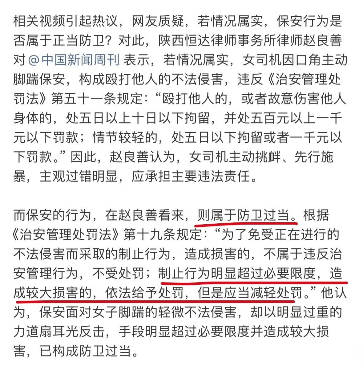 那么这到底是“正当防卫”还是“互殴”?有网友说:“保安先夹伤人,属于故意侵权,女子脚踹是正当防卫,而保安扇耳光明显是报复,属于故意伤害,必须严惩!”