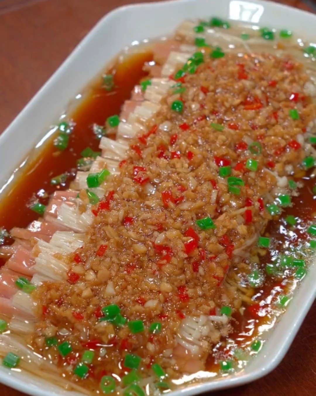 制作的方法:先把金针菇弄小一些,摆放在盘中铺一层底,再把火腿肠切成小长条,切好放在金针菇上,然后再往火腿肠上铺一层金针菇。接着我们制作一个蒜蓉汁,空碗中放入蒜末和小米辣,淋入热油激发香味再放入生抽,蚝油,白糖,食用盐,搅拌均匀再倒在金针菇上。随后起锅烧水,等待锅中水开上锅蒸八分钟再撒入葱花点缀,淋入热油激发香味,这道美食就制作好了。这道美食孩子非常喜欢吃,尤其是火腿肠,有了这样一道美食,你还需要担心孩子挑食吗?