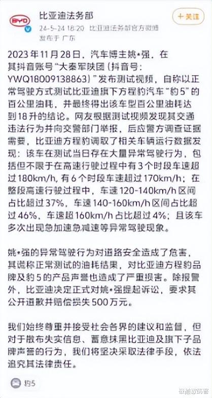 事件源于2023年12月方程豹豹5上市之际。抖音博主“大秦军陕团”(账号主体为姚某强)发布视频,宣称以“正常驾驶”方式测试豹5,测得百公里油耗高达18升,这一远超官方数据的结论迅速引发网络热议。