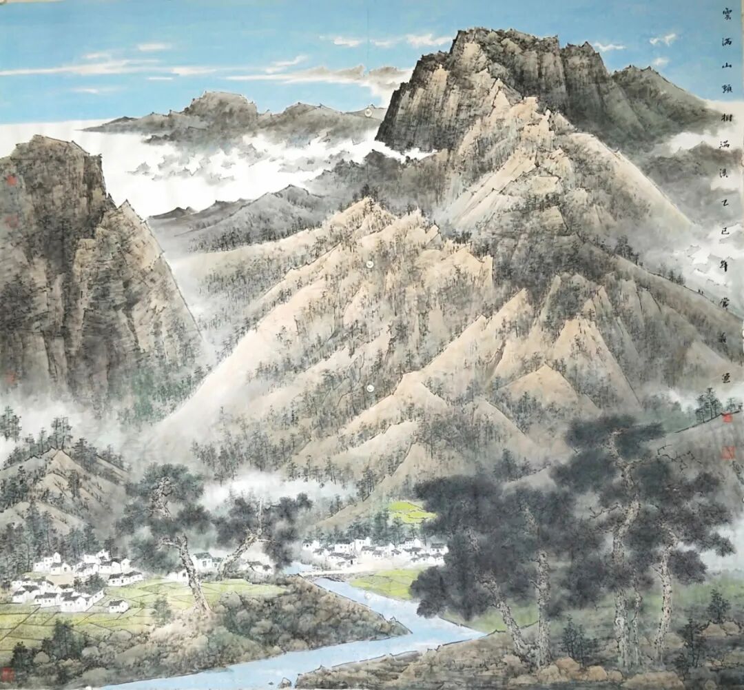周常义的山水画创新,主要体现在对传统笔墨的当代转化上。他通过"兼工带写"的技法体系,将传统文人画的写意精神与现代绘画的构成意识相结合,创造出既具有传统韵味又具有现代感的山水画风格。