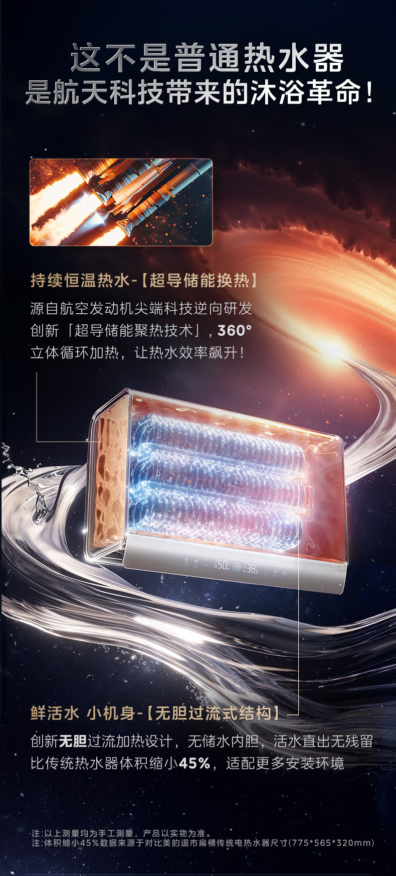 基于行业趋势和用户需求的深度洞察,美的从航天发动机的冷却换热器中得到启发,创新发明超导新能源热水器Z600,反向应用航天发动机冷却散热技术,把现有航天技术民用化,研发超导储能换热技术,仅需约30分钟即可完成储能,可连续输出2000L热水,400分钟持续供应,至多连续22人畅洗,相当于33台60L电热水器的水量,轻松满足三代同堂的多口大家庭使用,做到热水畅洗不限量,解决用户的沐浴续航焦虑。同时在节能方面,美的超导新能源热水器Z600采用一体化换热架构,360°全方位提升热效率,智能调节,按需供能,相比传统电热水器节能40%,让用户不再为高额电费而担忧。