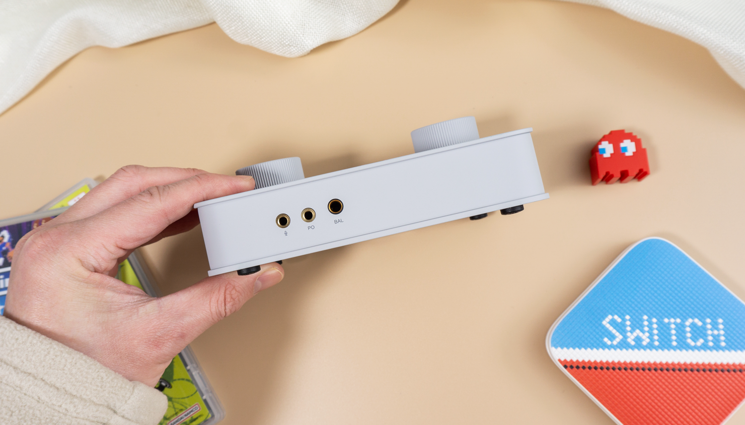 前脸部分,Fosi Audio K7设有三个插孔,依次为3.5mm麦克风孔、3.5mm单端耳机接口、4.4mm平衡耳机口。这种独立的接口布局,本身就表明了它兼顾游戏与高保真聆听的双重定位。