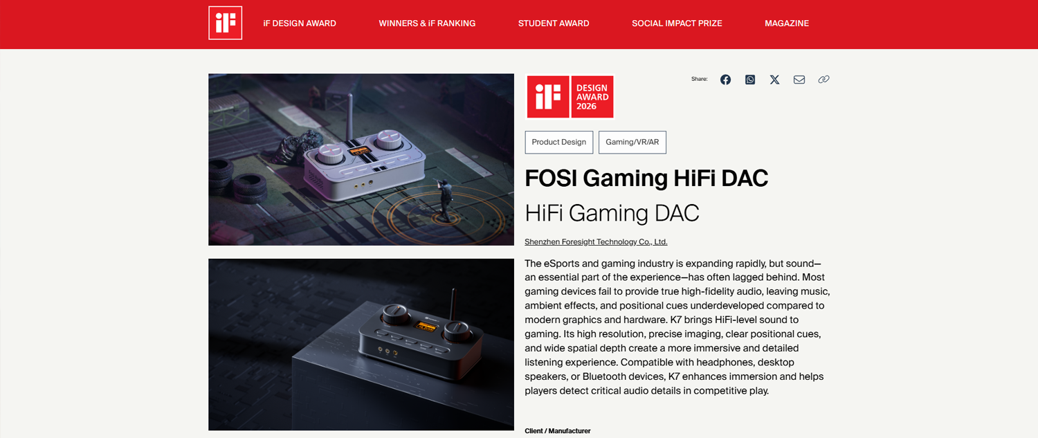 这几天在工位上摸鱼时,偶然刷到Fosi Audio(弗西)K7解码耳放一体机拿下2026年德国iF设计大奖的消息。说实在的,我一点也不觉得意外。毕竟从2024年底上市以来,K7已经陆续把日本VGP大奖等七项国际荣誉收入囊中。这次获奖,不过是给它本就琳琅满目的奖杯柜里,再添一枚意料之中的勋章。