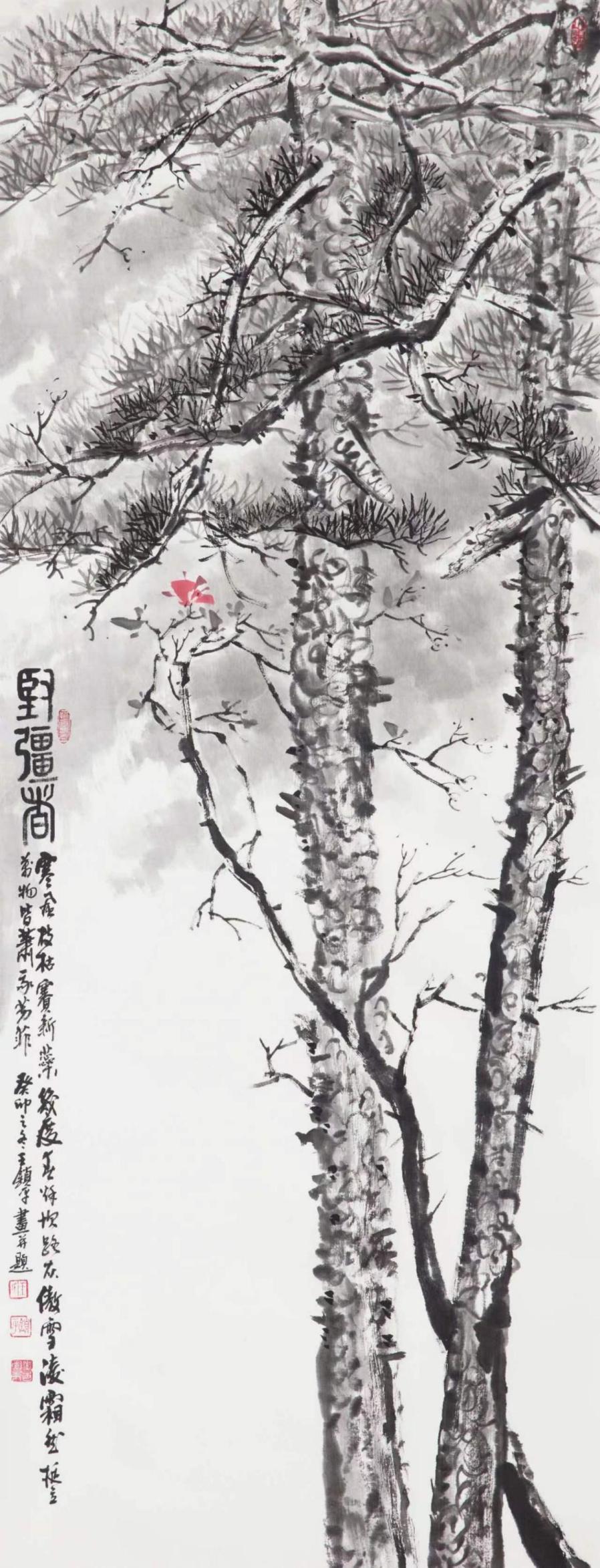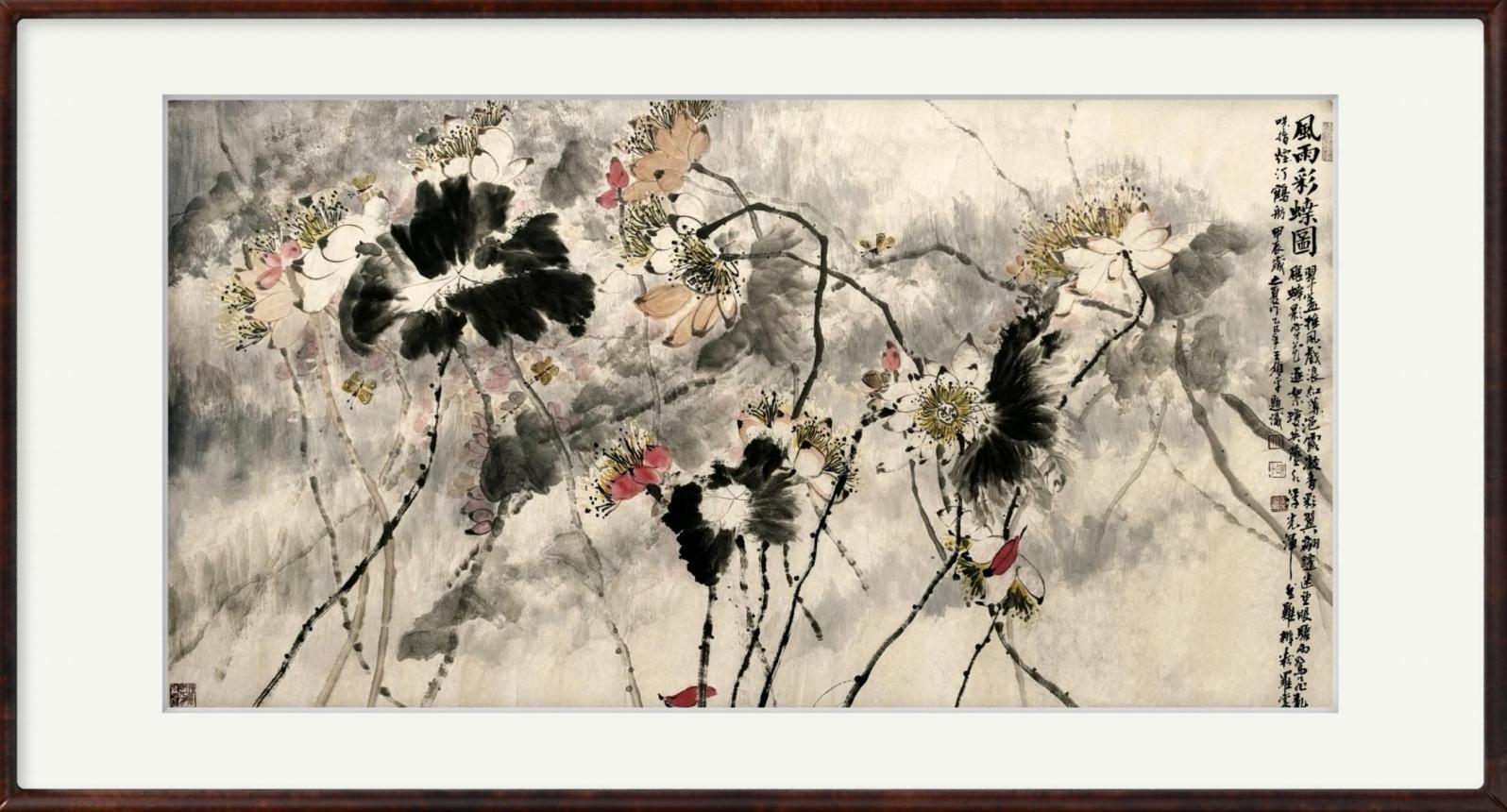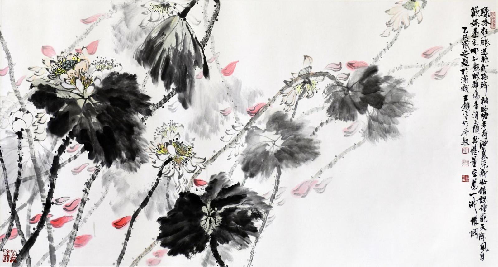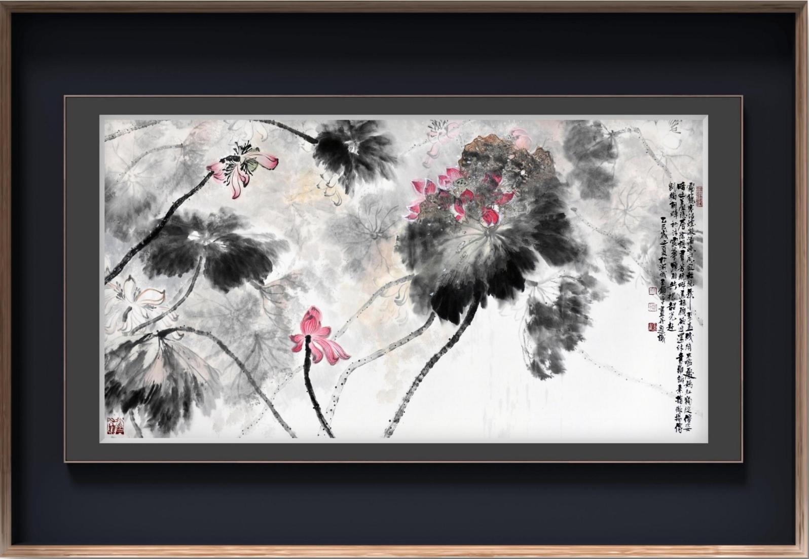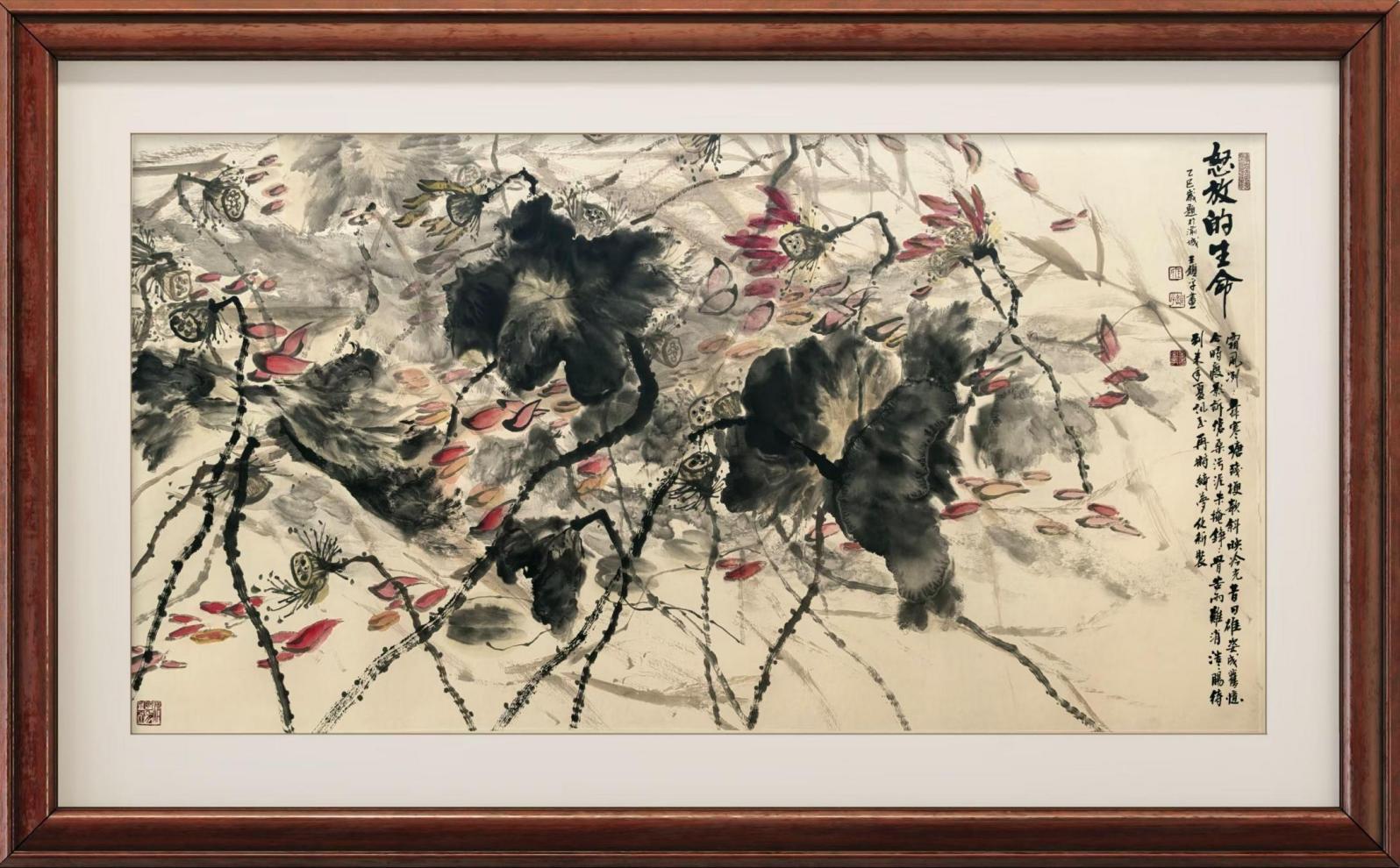 作品《秋荷》是王锁平“荷 ”系列中探讨生命衰变与永恒之美的其一。画面摒弃了繁华盛景,聚焦于霜后残荷。墨色运用堪称鬼斧神工:浓墨重笔描绘蜷缩枯败的荷叶,苍劲如铁;淡墨渴笔勾勒出纤韧的荷梗,摇曳生姿。左侧一朵粉荷逆时绽放,色彩娇而不艳,在一片衰颓中迸发出惊人的生命力,形成强烈的戏剧张力与哲学对比。题画诗“寒水洗残碧,霜景凋病早……不与繁英竞暖春 ”,以书法笔意融入画面结构,诗句内容与绘画互文,将物象之“残 ”提升至精神之“贞 ”的境界。整幅作品通过对“残缺美 ”的极致刻画,