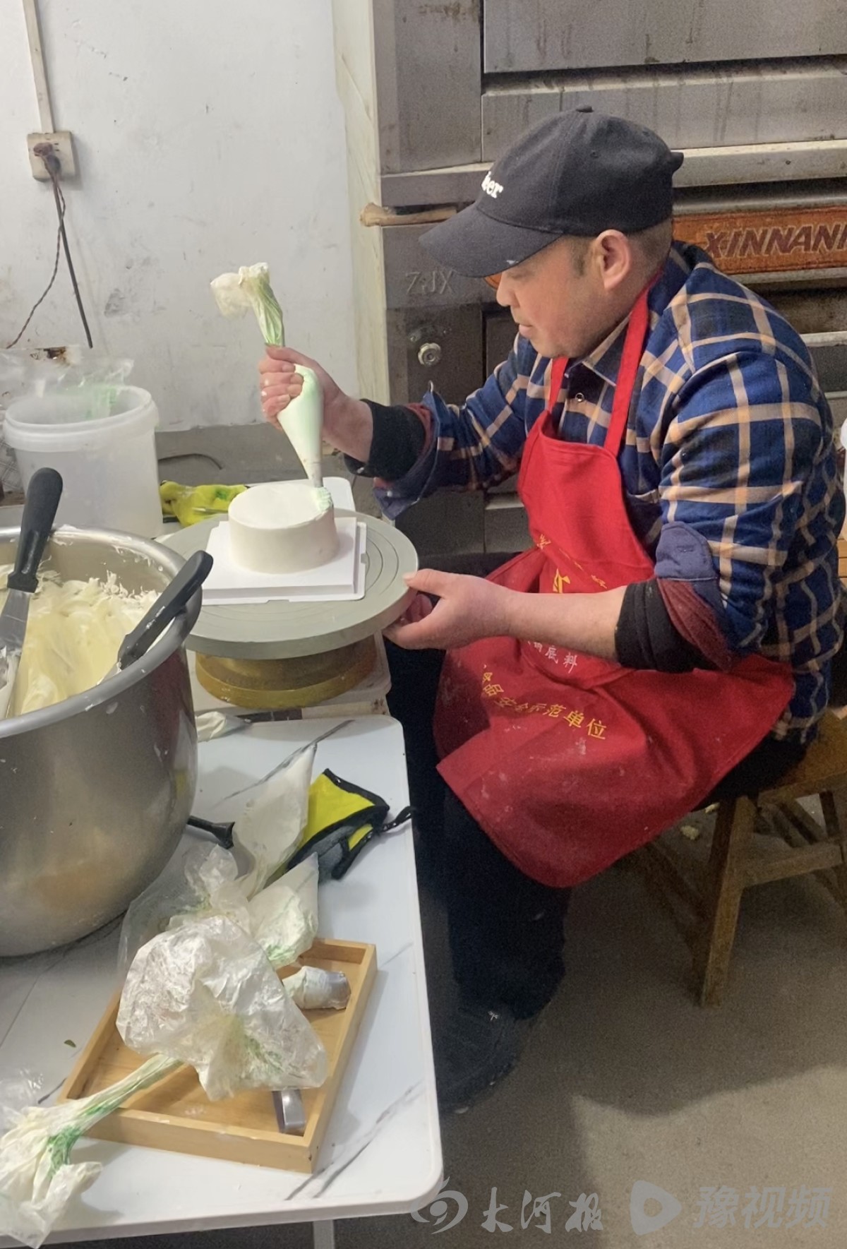 “我学会做蛋糕10多年时间了,以前俺侄子在城市里做蛋糕,这一套手艺还是跟他学哩。”谈及自己的经历,李师傅冻得红润的脸上露出笑意。