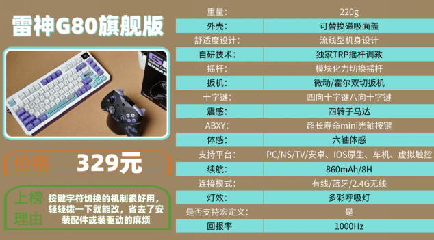 ◉兼容性方面,PC、Switch、Steam都可直连,固件优化后延迟压得很低,高节奏游戏里实际体验稳定性不错。它附带两款D-pad、三套摇杆帽,支持体感,还有180°防滑握柄,耐用性和稳固性都有照顾。通过APP可以调整按键映射、摇杆曲线、死区、体感灵敏度以及宏编程,算是给了玩家非常高的自由度。而RGB磁吸底座既能充电也能收纳,桌面观感也更统一。缺点方面,扳机锁行程略偏长,适合赛车但玩极端快触发的FPS时会觉得略拖;摇杆帽贴合感也有提升空间。续航方面,充满电的情况下可以使用10小时,对于平常喜欢玩游戏的人来说一次性续航时间是完全足够的。