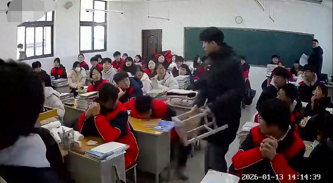 一、监控画面与回应的信息反差在这段传播的监控画面里,能看到一名学生身持板凳朝前排同学,接触后前排学生头部出现明显晃动,连带桌子都向前滑动了一段距离,随后该学生趴在桌上,身体状态看起来不佳。