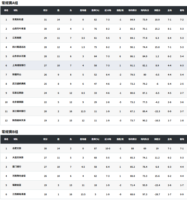 本赛季A组12队采取主客场双循环,一共进行22轮。目前,东莞(14胜3负)、山西(13胜4负)、山东(11胜6负)、江苏(11胜7负)、四川(12胜4负)已经确保前八名,锁定季后赛四分之一决赛资格,新疆(9胜8负)、上海(10胜7负)、武汉(8胜9负)距离八强也只差1-2场胜利,身后的石家庄与北京有5-6场胜利,落后第八名的武汉三个胜场,而倒数两名的陕西与浙江仅仅2胜,铁定无缘前八名。B组6队进行四循环20轮的赛制,目前合肥(14胜2负)、大连(11胜5负)、河南(10胜6负)、厦门(10胜7负)已经入围前四名,获得季后赛排位赛的资格,福建(3胜13负)、江西(1胜16负)后续比赛将为荣誉而战。